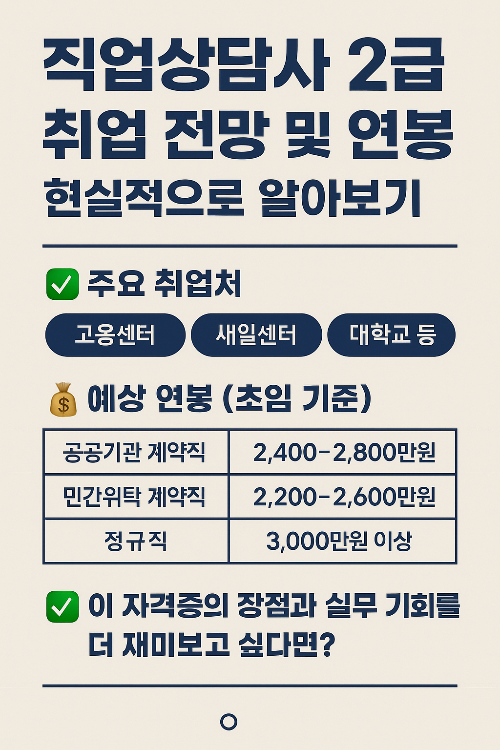 직업상담사 2급 자격증은 실무에서 활용도가 높고, 공공기관을 중심으로 꾸준한 채용 수요가 있는 유망 자격증입니다. 하지만 “이 자격증을 따면 바로 취업이 될까?”, “연봉은 어느 정도 받을 수 있을까?”라는 질문에 대해서는 조금 더 현실적인 분석이 필요합니다.